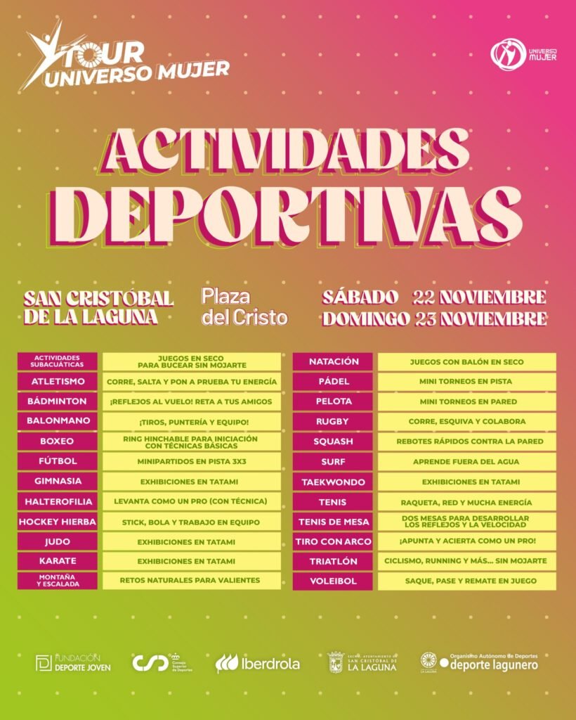 El Tour Universo Mujer llega a las Islas Canarias para cerrar su novena temporada. Los días 22 y 23 de noviembre, la Plaza del Cristo, de San Cristóbal de La Laguna, acogerá este evento gratuito impulsado por Iberdrola, el Consejo Superior de Deportes y la Fundación Deporte Joven, y que, en este caso, cuenta con el apoyo del Ayuntamiento de San Cristóbal de La Laguna.