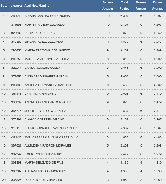 De principio a fin, Ariana Santiago y Marietta Vega han dominado la competición en categoría infantil. Suman 6.397 puntos tras haber disputado 10 torneos, todos como pareja. De ellos, seis pruebas le computan para el average con 4.297 puntos que les permiten compartir la primera posición del ranking.