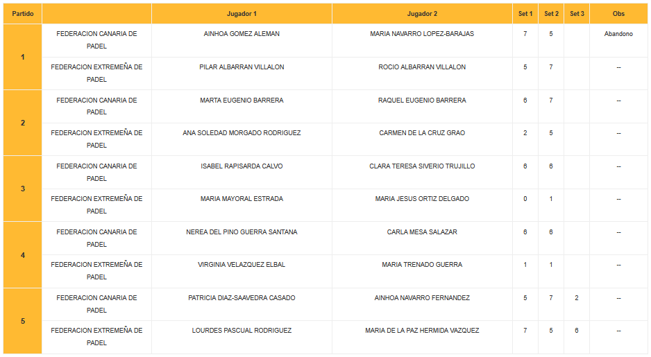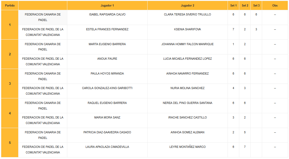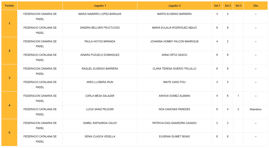 Raquel Eugenio y Clara Teresa Siverio sumaron para Canarias ante Ares Llobera y Maite Cano (6-3 y 6-4). Para las catalanas, en cambio, amarraron la victoria Sandra Bellver y Laia Rodríguez contra María Navarro y Marta Eugenio (6-3 y 6-4); Ainara Pozuelo y Anna Ortiz ante Paula Hoyos y Johanna Hommy Falcón (6-4 y 6-2); y Xenia Clasca y Eugenia Guimet contra Isabel Rapisarda y Patricia Díaz-Saavedra (6-3 y 6-3).