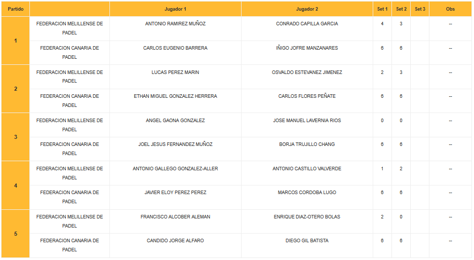 El conjunto canario arrancó con paso firme ante Melilla (5-0). Carlos Eugenio e Íñigo Jofre se impusieron Antonio Ramírez y Conrado Capilla (6-4 y 6-3); Ethan González y Carlos Flores vencieron a Lucas Pérez y Osvaldo Estévanez (6-2 y 6-3); Joel Jesús Fernández y Borja Trujillo no dieron opción a Ángel Gaona y José Manuel Lavernia (6-0 y 6-0); Javier Eloy Pérez y Marcos Córdoba derrotaron a Antonio Gallego y Antonio Castillo (6-1 y 6-2); y Cándido Alfaro y Diego Gil completaron el pleno ante Francisco Alcober y Enrique Díaz-Otero (6-2 y 6-0).