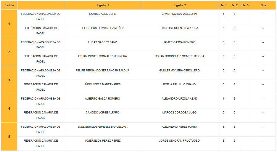 Para los aragoneses anotaron Lucas Garcés y Javier Gasca ante Ethan González y Óscar Domínguez (6-0 y 6-3); y José Enrique Giménez y Alejandro Pérez contra Javier Eloy Pérez y Jorge Señorán (6-3 y 6-2).
