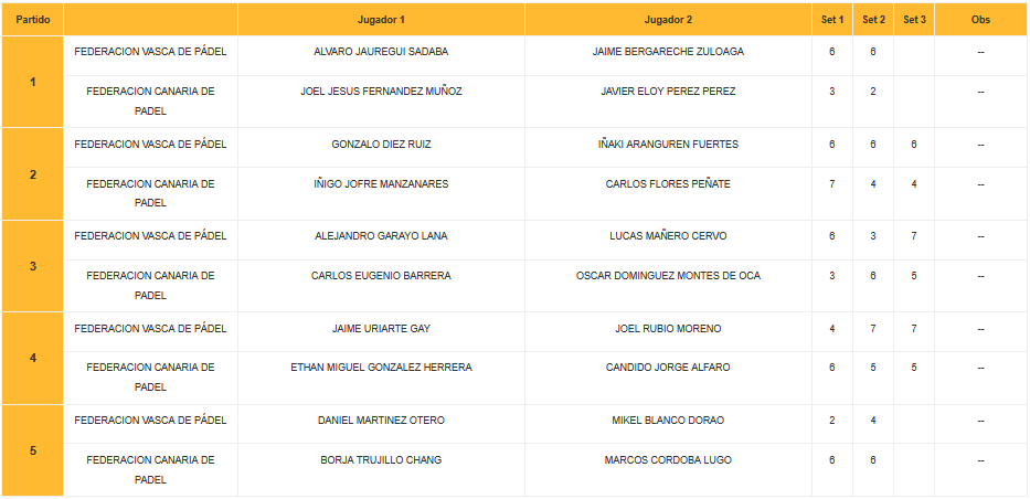 La eliminatoria definitiva para dirimir al campeón de 2ª resultó trepidante. Borja Trujillo y Marcos Córdoba sumaron para Canarias ante Daniel Martínez y Mikel Blanco (6-2 y 6-4); mientras que Álvaro Jáuregui y Jaime Bergareche abrieron el marcador vasco ante Joel Fernández y Javier Eloy Pérez (6-3 y 6-2).
