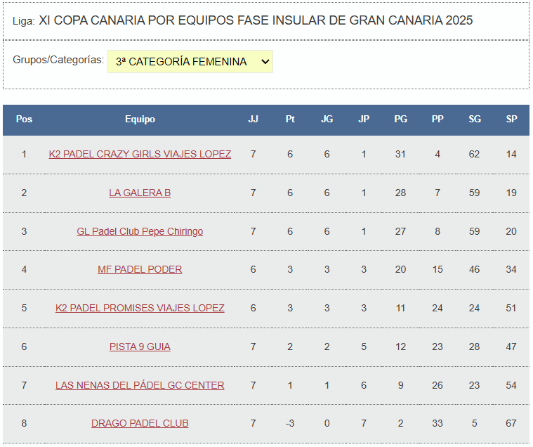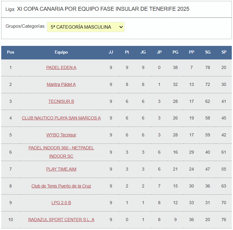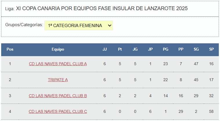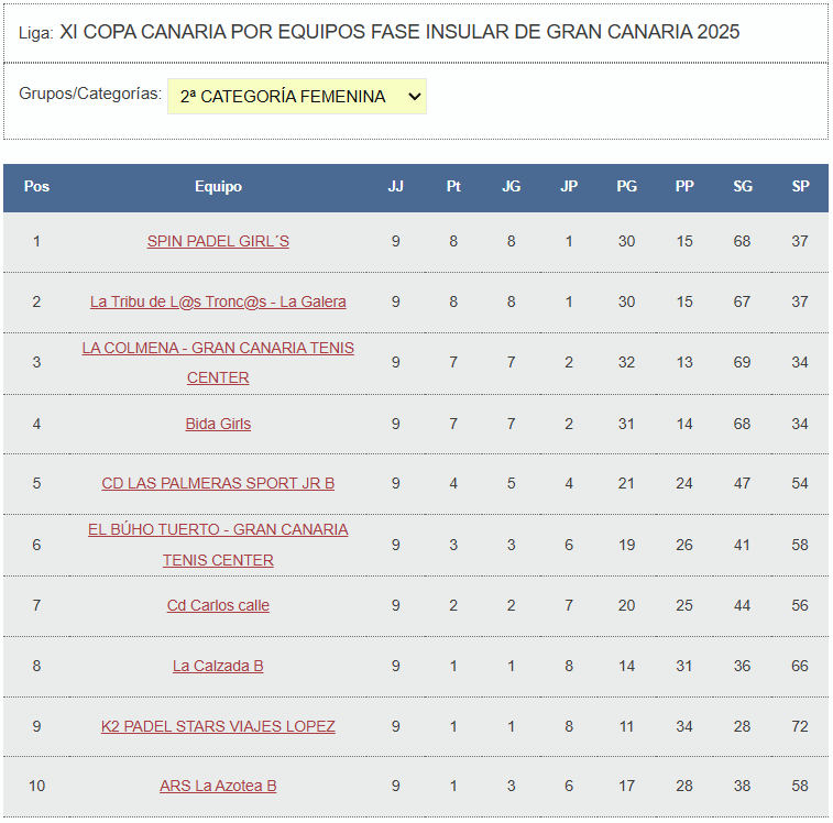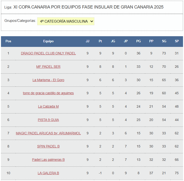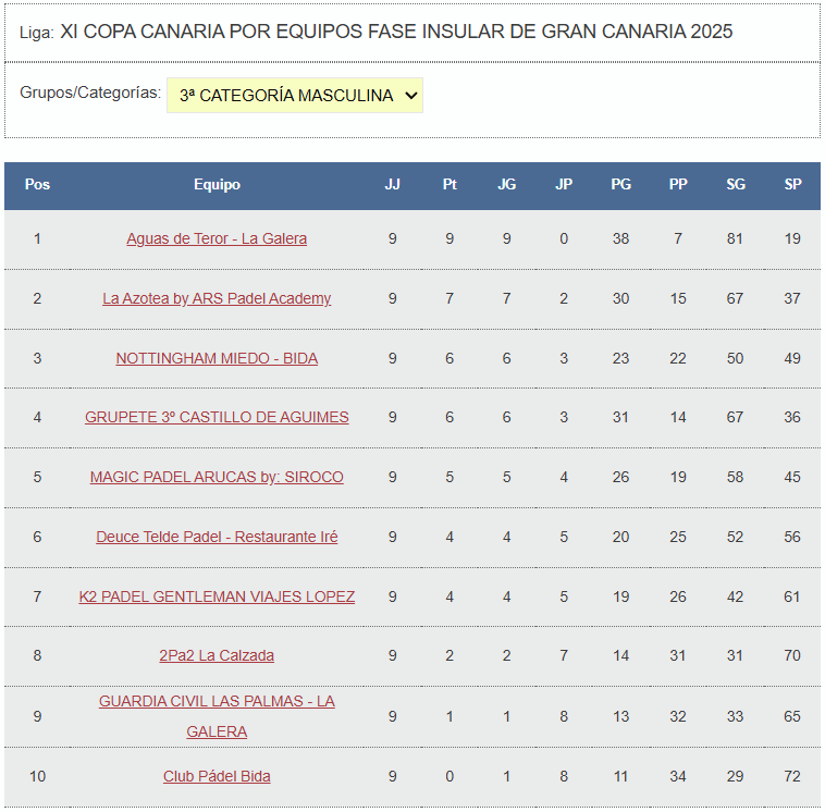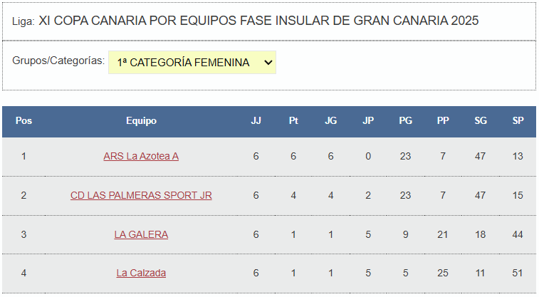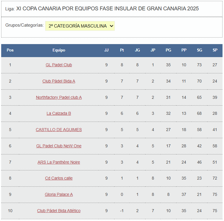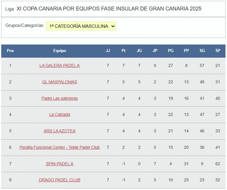 En la tabla de 1ª masculina, La Galera A, campeón, GL Maspalomas, Las Palmeras y La Calzada Be Active han logrado la clasificación. De la liga de equipos de mujeres parten ARS Pádel A y Las Palmeras.