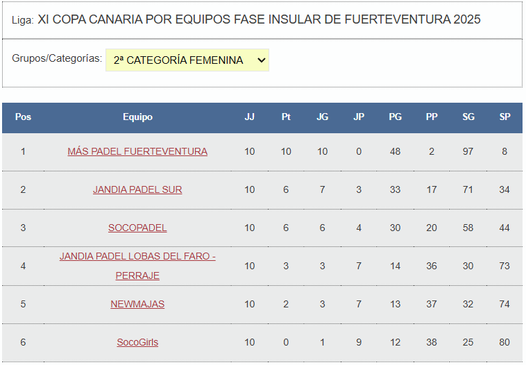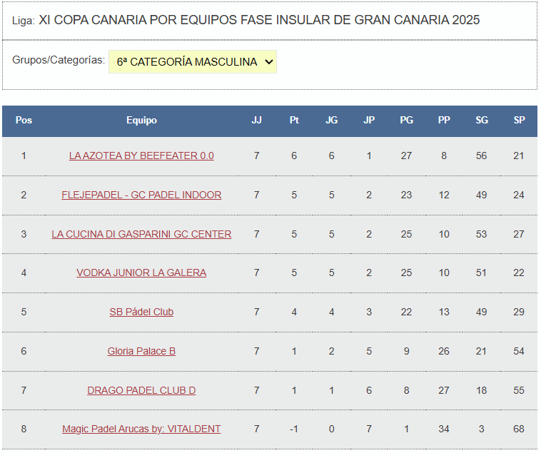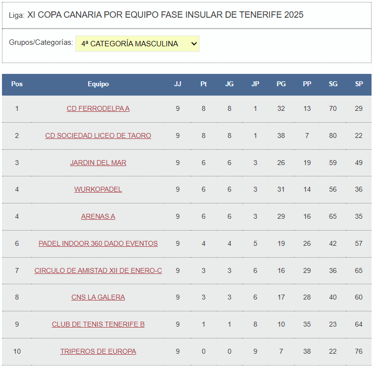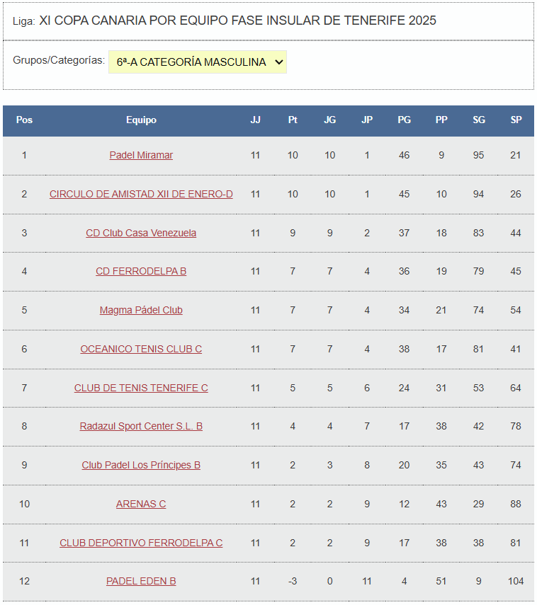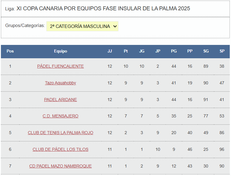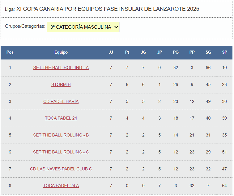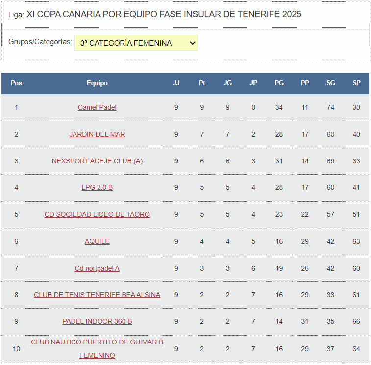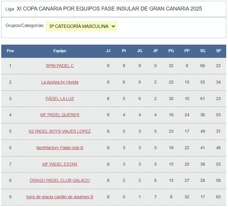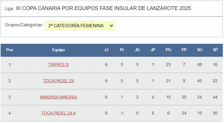 En la tabla de 1ª masculina, La Galera A, campeón, GL Maspalomas, Las Palmeras y La Calzada Be Active han logrado la clasificación. De la liga de equipos de mujeres parten ARS Pádel A y Las Palmeras.