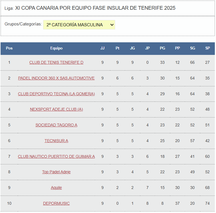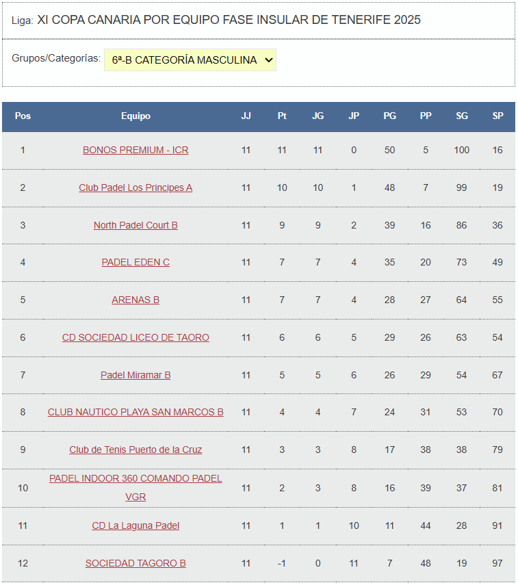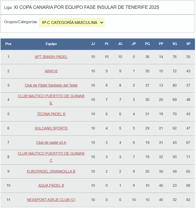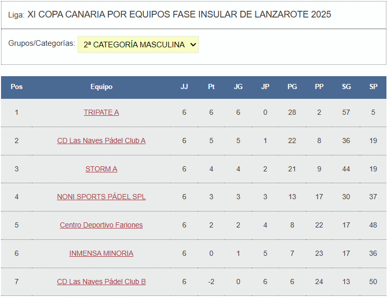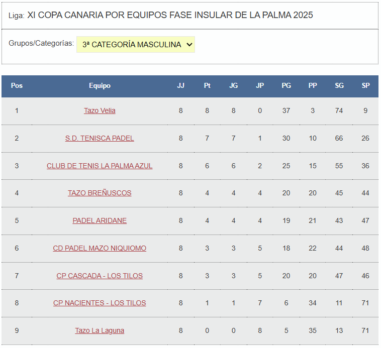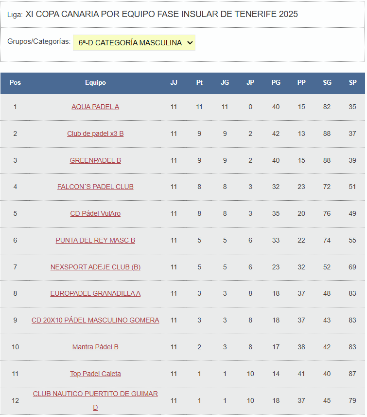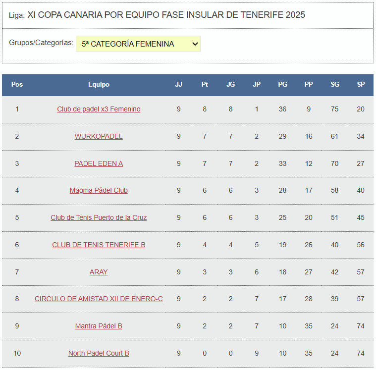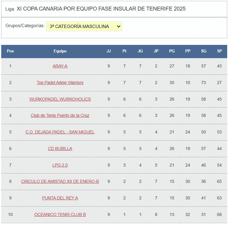 En la tabla de 1ª masculina, La Galera A, campeón, GL Maspalomas, Las Palmeras y La Calzada Be Active han logrado la clasificación. De la liga de equipos de mujeres parten ARS Pádel A y Las Palmeras.