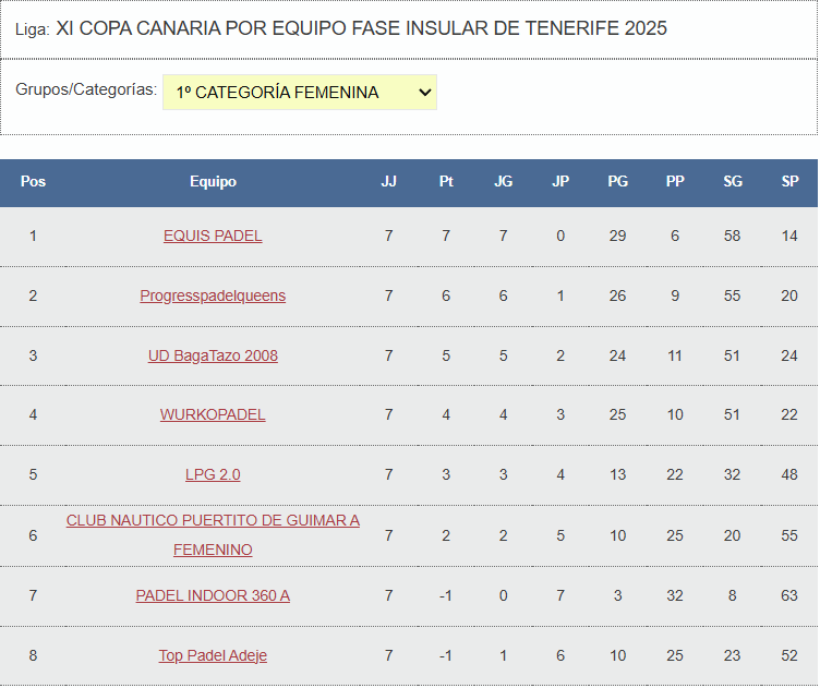 En la modalidad femenina de 1ª, las grandes vencedoras han sido las del conjunto de Equis Pádel, líder de la tabla. Por detrás quedan Progress Padel Queens, UD BagaTazo 2008 y Wurkopadel. Las cuatro escuadras tienen plaza en la Fase Final de esta Copa Canaria.