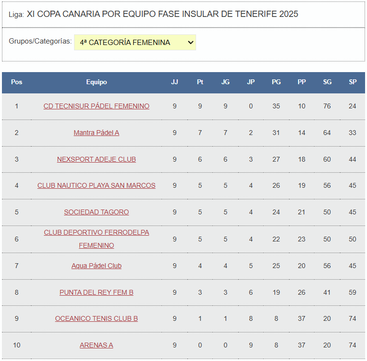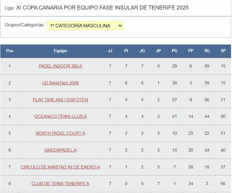 Pierden su plaza en 1ª categoría los equipos masculinos de Círculo de Amistad XII de Enero A y Club de Tenis Tenerife A, y los femeninos de Padel Indoor 360 A y Top Padel Adeje.