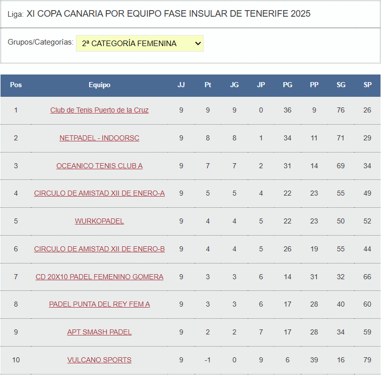 De la femenina se clasifican Club de Tenis Puerto de la Cruz, líder, y Netpadel- Indoor SC, segunda formación; dos escuadras que también estarán en 1ª el próximo curso.